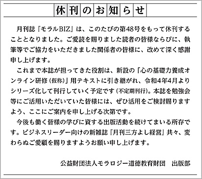 『モラルBIZ』は、公益財団法人モラロジー道徳教育財団が主催するモラル研修やセミナーの90年におよぶ実績をもとに、実際に職場で起こりうる問題を各号のテーマとして取り上げています。職場の相互理解を深め、働きやすい職場風土を築くために、『モラルBIZ』をご活用いただくことをおススメします!
