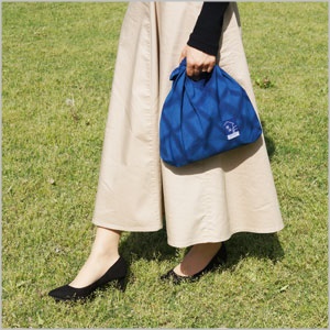 「あずま袋」は、バッグでありながら風呂敷のように畳めて、持ち運びしやすい便利なアイテム。江戸時代にルーツをもつ「あずま袋」。藍染の雪花絞りの生地に財団オリジナルタグをつけました。