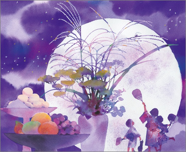 「月白」と書いて「つきしろ」と読むと、月が昇る頃の東の空が明るんでいく様子を意味し、 「げっぱく」と読めば、冴え冴えとした月の光そのもののような色の名となる。 餅をつくウサギに、竹取物語のかぐや姫。月は童謡にもたくさん歌い込まれてきた。 月は私たちの心を、空想の翼に乗せて遠い夢の世界へといざなってくれる。