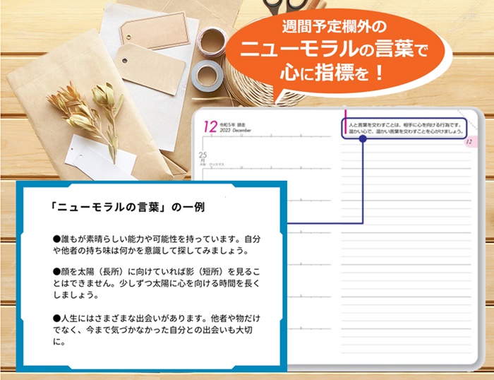 - 週間予定表の欄外には、心を整える「ニューモラルの言葉」を掲載!