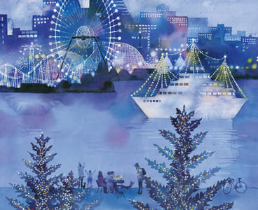 冬の日は短い。暮れ時、太陽は暗い空の色を残り香でほの赤く染め、沈み行く海の青にも溶けてなじむ。黄昏時に辺りに立ち込めるこの紅がかった暗い青の色合いを「紅碧」と昔の人は名づけた。そこにさらに点滅する無数の人工の光の色を加えて、現代版「紅碧」は明るく華やぎがある。