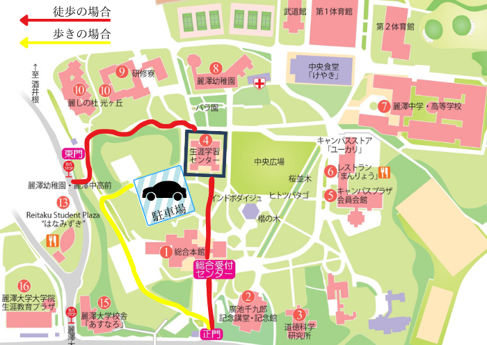・お車の場合は、水色の斜線部分(車のマーク)に駐車してください。
