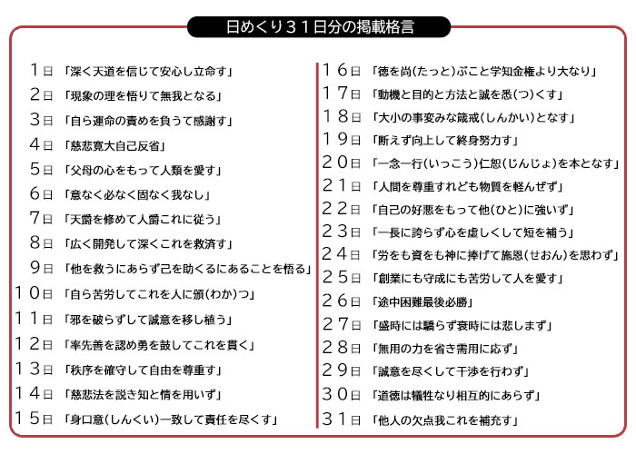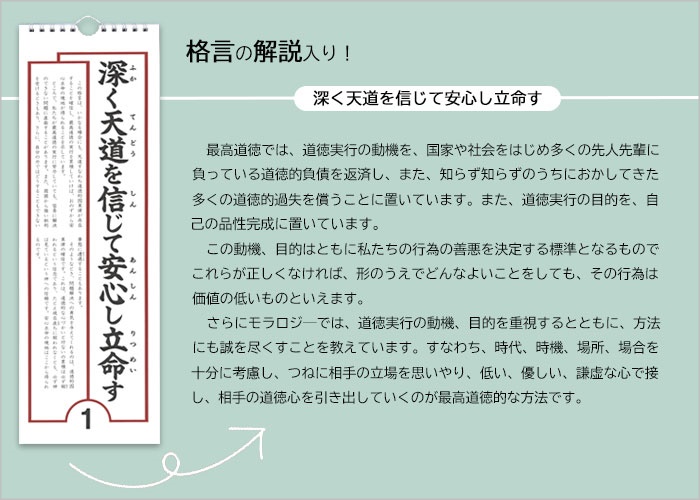 『最高道徳の格言』から選んだ31の格言と解説が、日めくり式のカレンダーになっています。